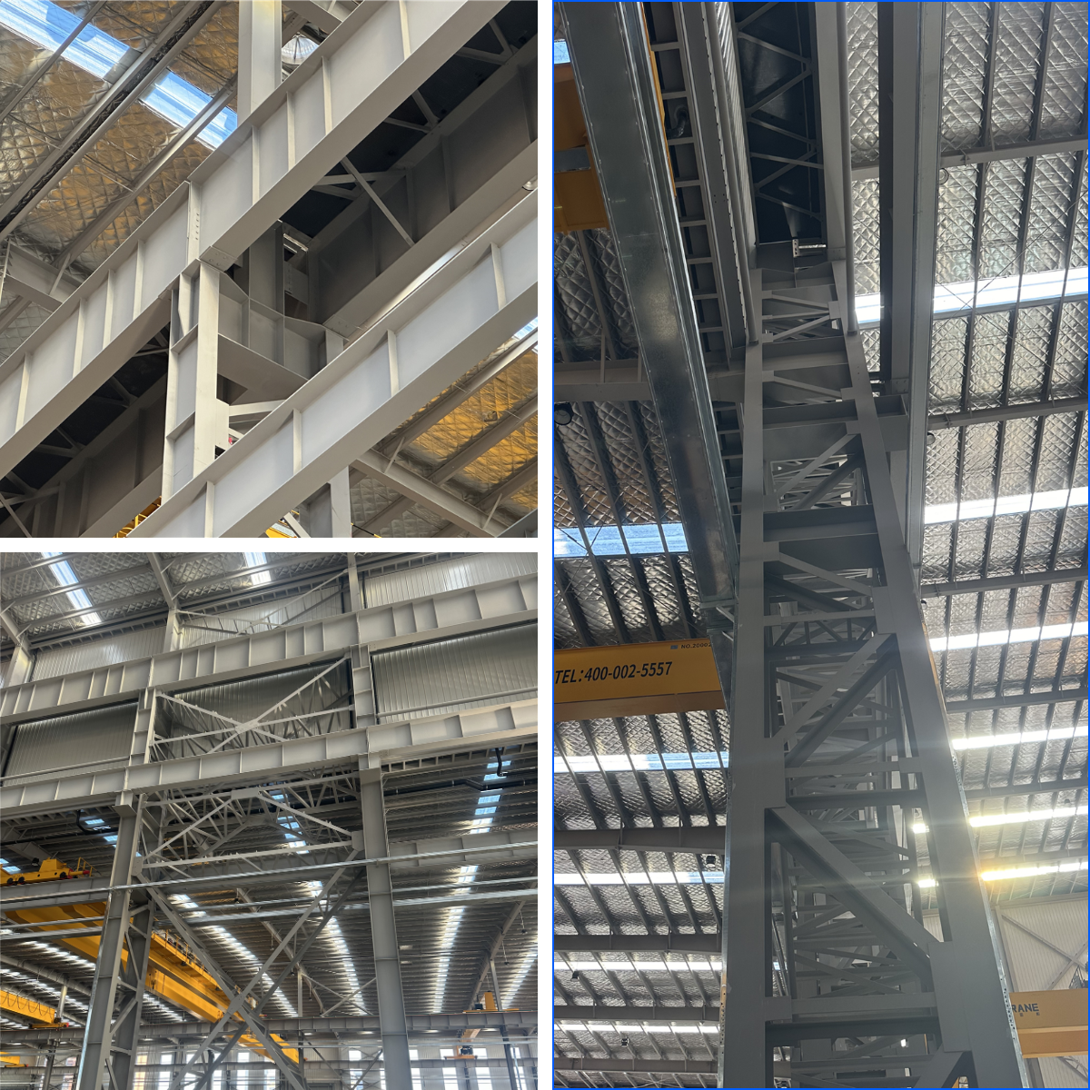 本項(xiàng)目1#廠房檐口高度15m左右,最大跨度25m,單臺(tái)吊車最大噸位32t,為單層鋼結(jié)構(gòu)廠房;2#廠房檐口高度26m,最大跨度32m,單臺(tái)吊車最大噸位200t,為重鋼廠房。